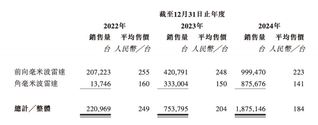 2022 年至 2024 年天源国际,承泰科技毫米波雷达产品的销量分别为 22.10 万台、75.38 万台和 187.51 万台,平均售价分别为 249 元 / 台、204 元 / 台和 184 元 / 台。