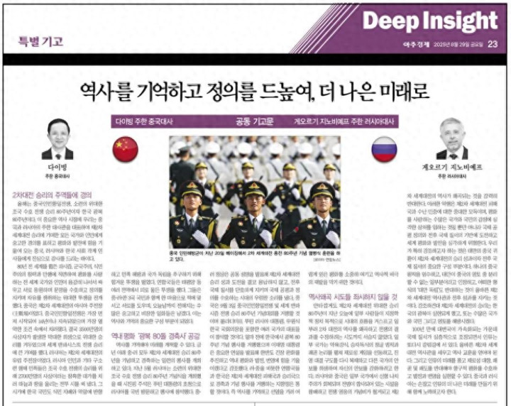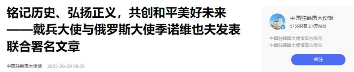 中国驻韩国大使馆2025-08-29《铭记历史、弘扬正义,共创和平美好未来——戴兵大使与俄罗斯大使季诺维也夫发表联合署名文章》