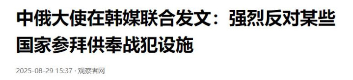 参考资料:观察者网2025-08-29《中俄大使在韩媒联合发文:强烈反对某些国家参拜供奉战犯设施 》
