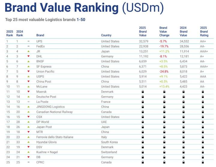 榜单前五名分别是联合包裹(UPS)、联邦快递(FedEx)、日本铁路公司(JR)、德国敦豪(DHL)、BNSF。虽然品牌价值同比下滑5.7%,UPS仍以325.8亿美元(约合人民币2335亿元)连续第11年成为全球最具价值的物流品牌。