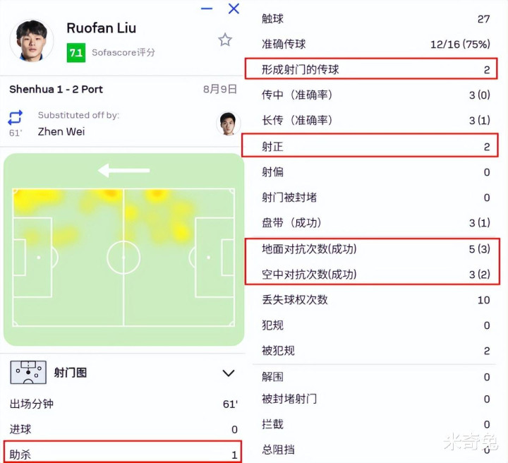 与旧主申花的这场比赛中,刘若钒不只是贡献了助攻,还有8次一对一赢下5次,贡献2次关键传球,2次射门全部射正,还制造了申花2次犯规。很可惜,那次内切进禁区的射门没有打进。